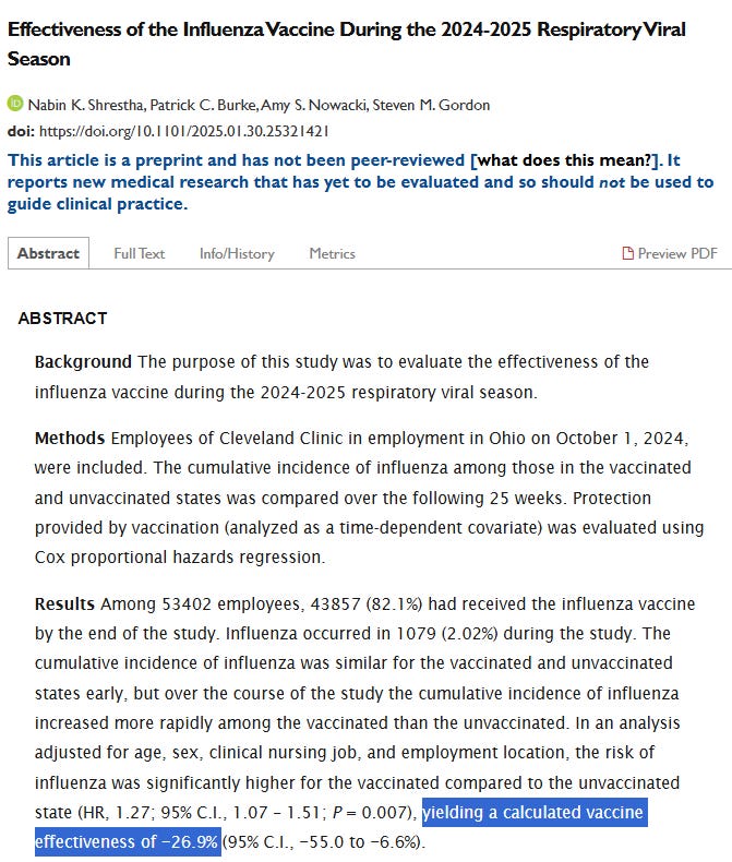 One of the most recent studies on “Effectiveness of the Influenza Vaccine” from the previous season - with employees from the Cleveland Clinic, showed that there was a -26.9% vaccine effective rate: