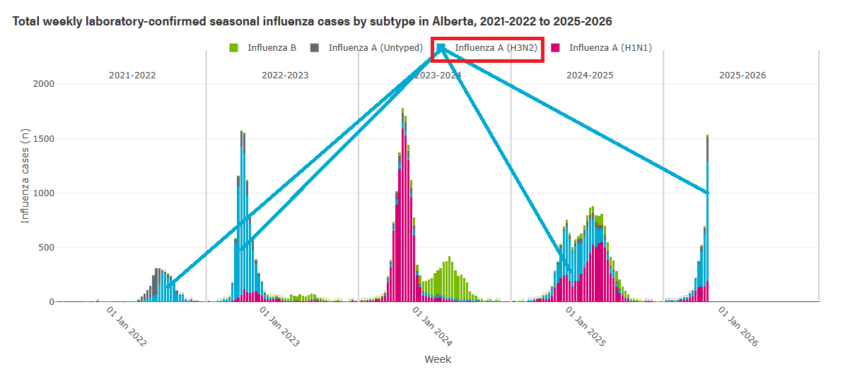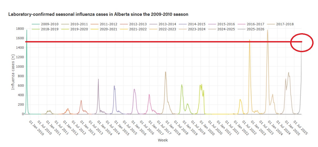 On the Alberta Dashboard for Respiratory Viruses, we get a look at what this season is looking like and it seems like Influenza is poised to be a record breaker!