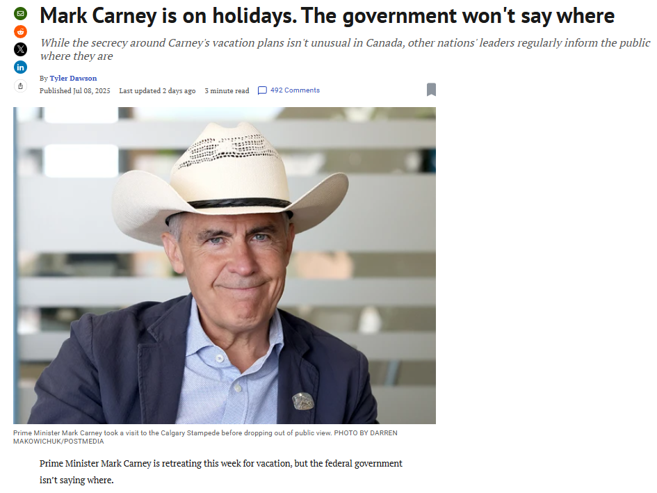 The last federal election stolen by the Liberals on sloganing Carney as the ‘Best Person to Deal with Trump’, meanwhile…he caved on every threat of counter tariffs, and the Digital Services Tax, “to advance broader trade negotiations with the United States”…called our economy, tariffs and the worst economic crisis in Canada…and then without accomplishing a single thing…goes on Vacation to an undisclosed location: