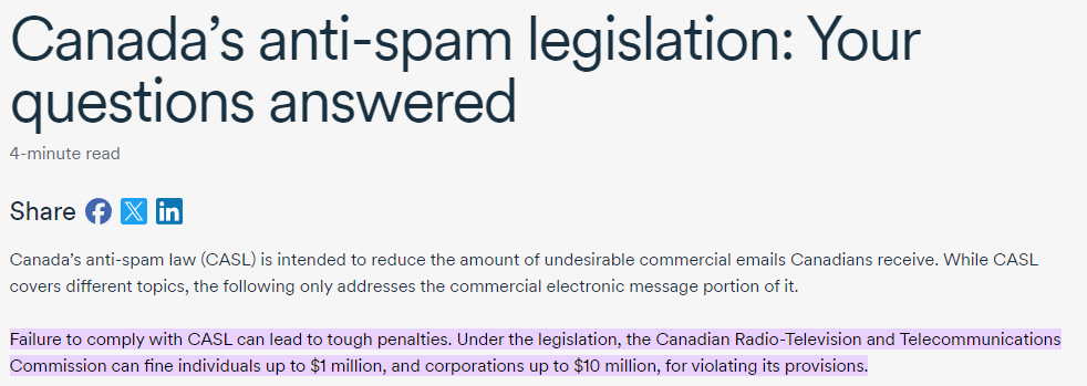 Add to this, that Canada has Anti-Spam legislation, where by if you are not compliant with Canada’s anti-spam law (CASL), you can be fined up to $1 Million as an individual to $10 Million for corporations.