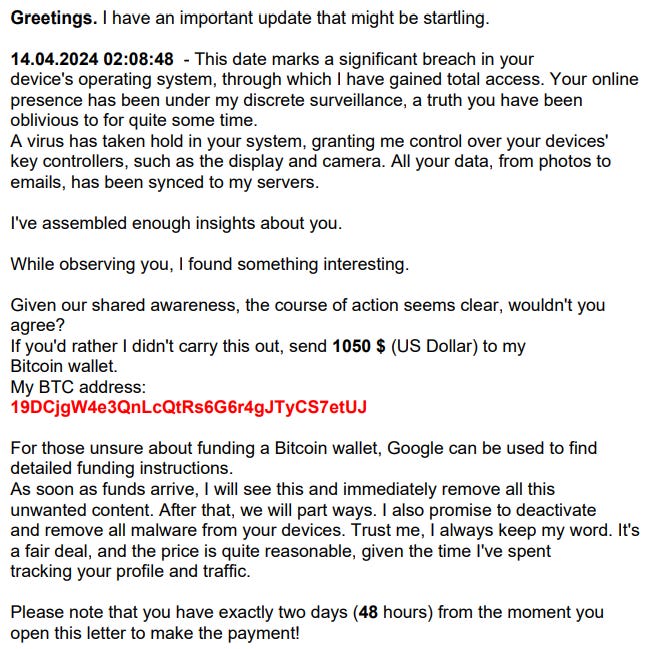 Welp…today, my online breach went from a simple hack to extortion. Received this at one of my email addresses: