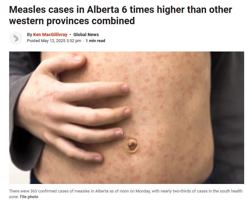 Note the tiny description below the photo - There were 365 cases of measles in Alberta as of noon on Monday (yesterday).